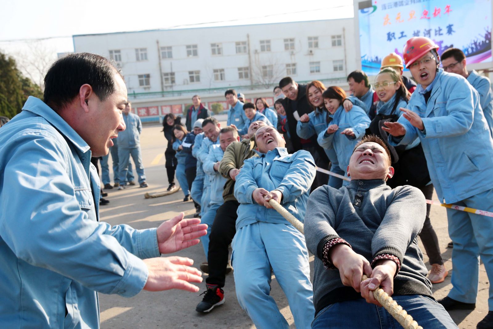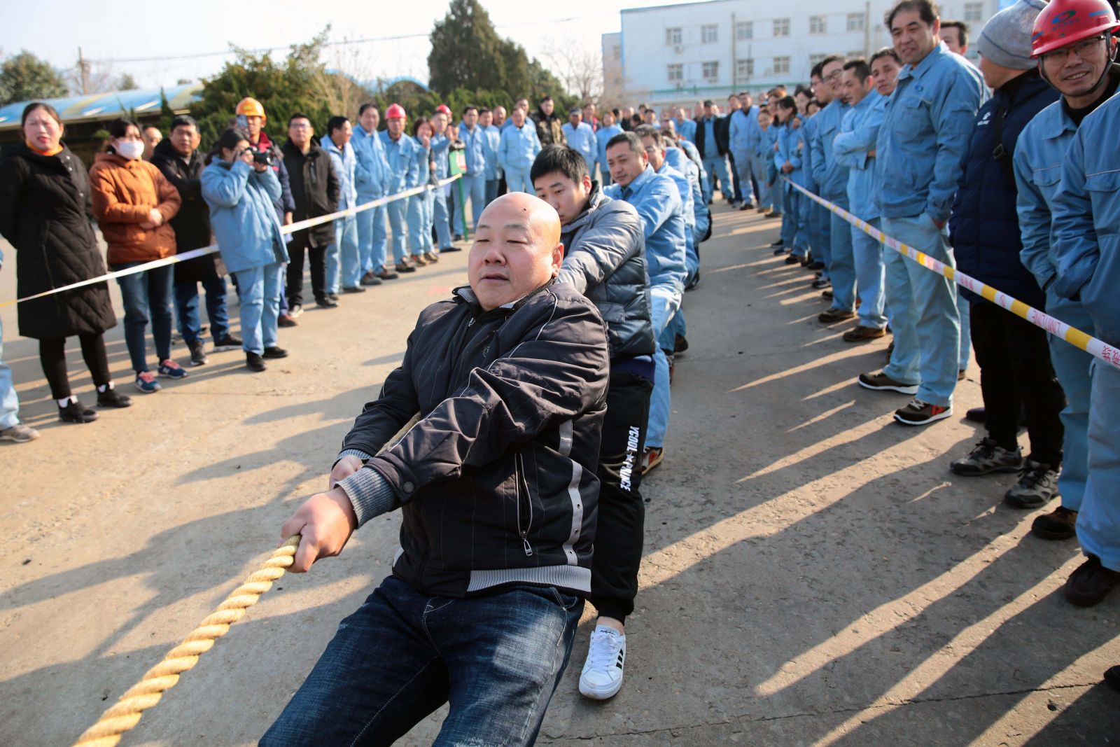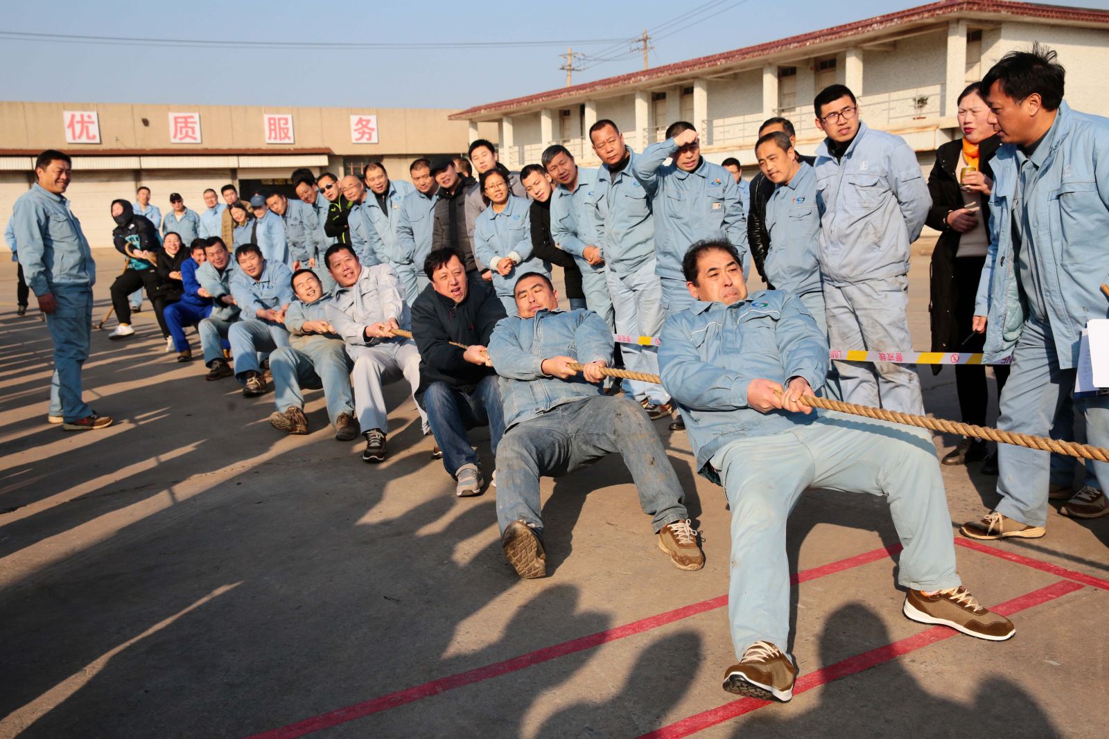 隨著裁判的一聲哨響,各名選手緊握繩索,咬緊牙關(guān),一觸即發(fā),彎腰、下蹲、跨步,后仰、發(fā)力,整個(gè)動(dòng)作整齊劃一,一氣呵成。未參賽的員工自發(fā)組成啦啦隊(duì)為比賽隊(duì)員助威,加油聲、吶喊聲、喝彩聲,此起彼伏,飄蕩在公司上空。
