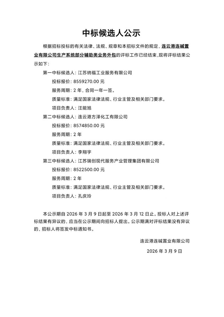 連云港連堿置業(yè)有限公司生產(chǎn)系統(tǒng)部分輔助類(lèi)業(yè)務(wù)外包中標(biāo)候選人公示