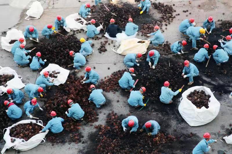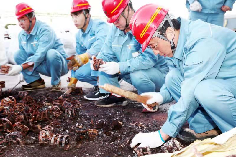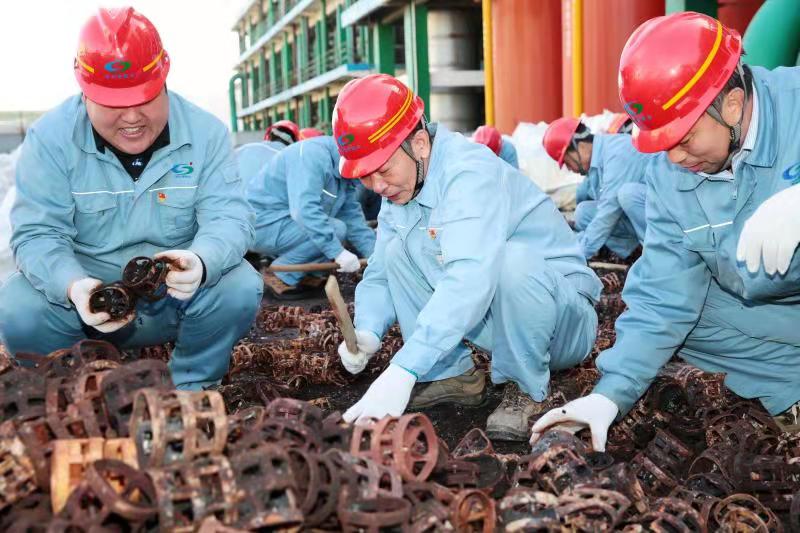 由于清理工作全靠人力完成,崗位人員一邊要維持生產(chǎn),一邊要清理填料,工作量非常大。11月12日下午,公司黨委書記、董事長張衛(wèi)民在調(diào)研重堿車間生產(chǎn)現(xiàn)場時(shí)了解到這一情況后,當(dāng)機(jī)立斷,立即組織公司領(lǐng)導(dǎo)及各部門黨員干部義務(wù)勞動,協(xié)助重堿車間完成鮑爾環(huán)填料清理回收工作。