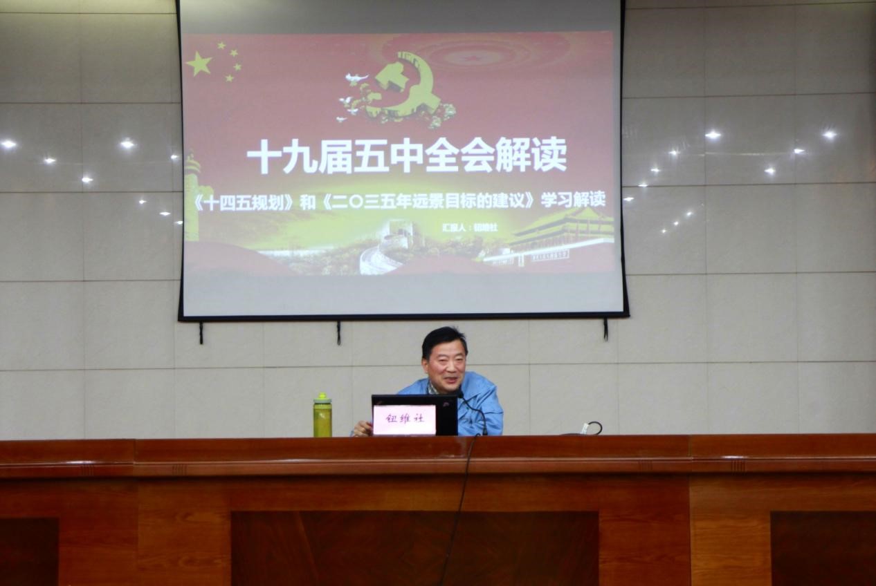 會(huì)上,鈕維社從“十九屆五中全會(huì)簡(jiǎn)介”、“全會(huì)召開的背景和意義”、“回眸與展望”、“二0三五年遠(yuǎn)景目標(biāo)”、“十四五規(guī)劃”五個(gè)方面,結(jié)合具體事例,用通俗易懂的語言進(jìn)行了全面準(zhǔn)確的闡述,對(duì)我們認(rèn)真領(lǐng)會(huì)、準(zhǔn)確把握十九屆五中全會(huì)精神實(shí)質(zhì)具有十分重要的意義。