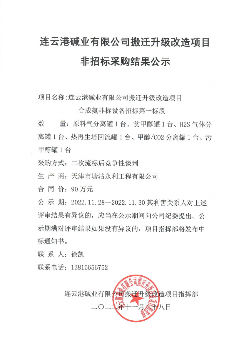 合成氨非標設備招標第一標段非標采購結(jié)果公示