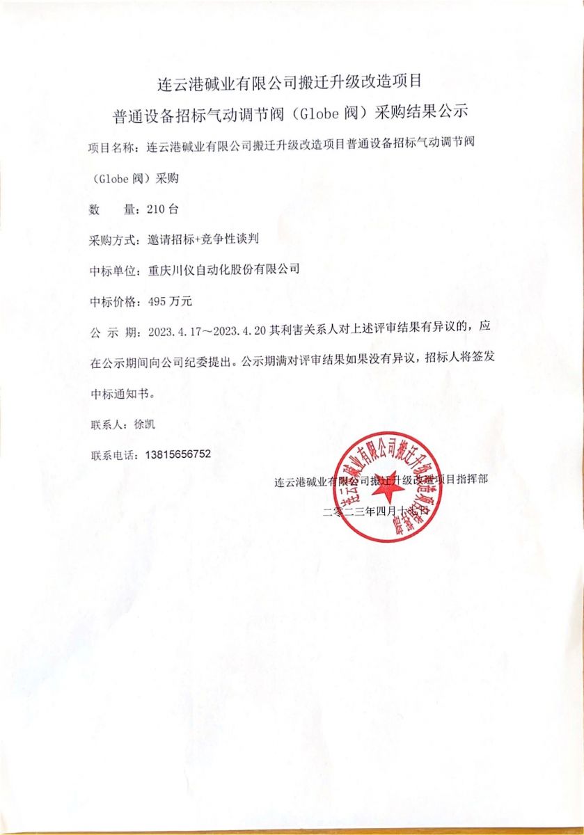 氣動(dòng)調(diào)節(jié)閥(Globe閥)采購(gòu)結(jié)果公示