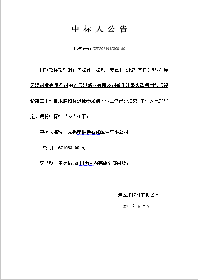 搬遷升級改造項(xiàng)目普通設(shè)備第二十七期采購招標(biāo)過濾器采購中標(biāo)人公告