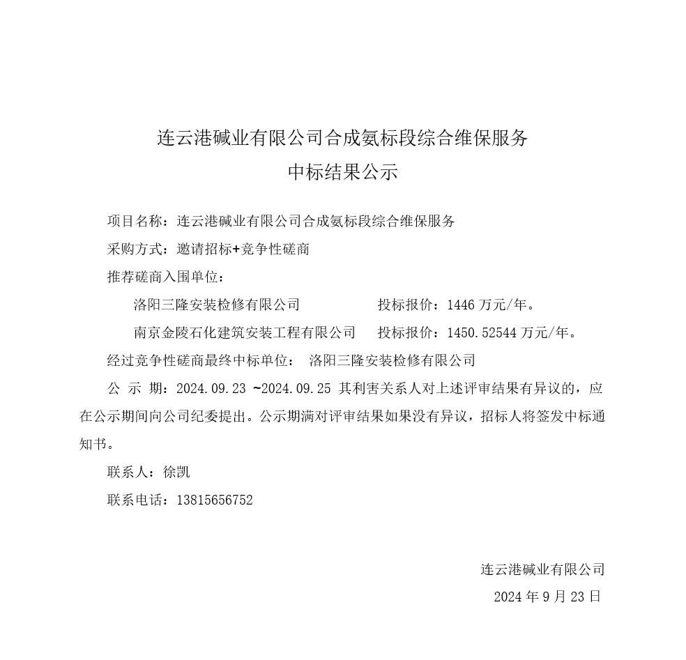 合成氨標段綜合維保服務(wù)中標結(jié)果公示