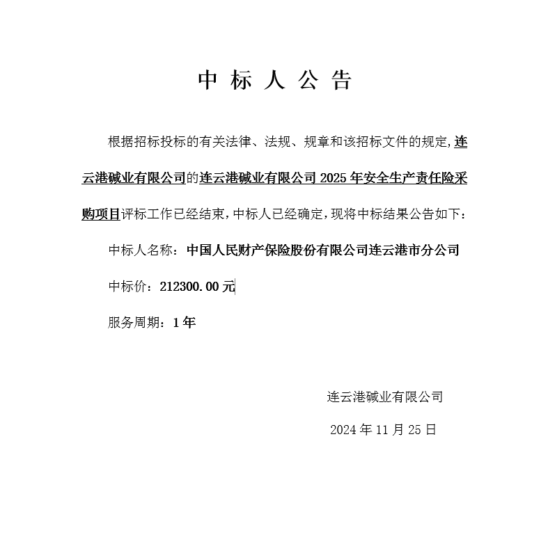 連云港堿業(yè)有限公司2025年安全生產(chǎn)責任險采購項目中標人公告
